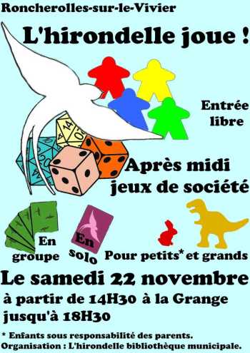 La bibliothèque municipale propose des après-midis de jeux de société, ouverts à tous, en groupe ou en solo, pour les petits et les grands. Ces rencontres ont lieu plusieurs samedis dans l'année, de 14h30 à 18h30, à la Grange.